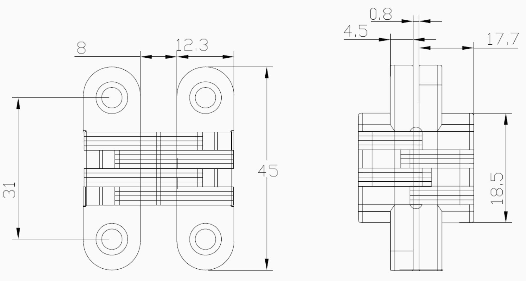 For dimensions see technical drawing (mm) : [caption id="attachment_29054" align="alignnone" width="422"] Concealed furniture hinge from UMAXO®, 45 x 13 mm made of Zamak, with stainless steel finish. Technical drawing[/caption] Manufacturer reference number: