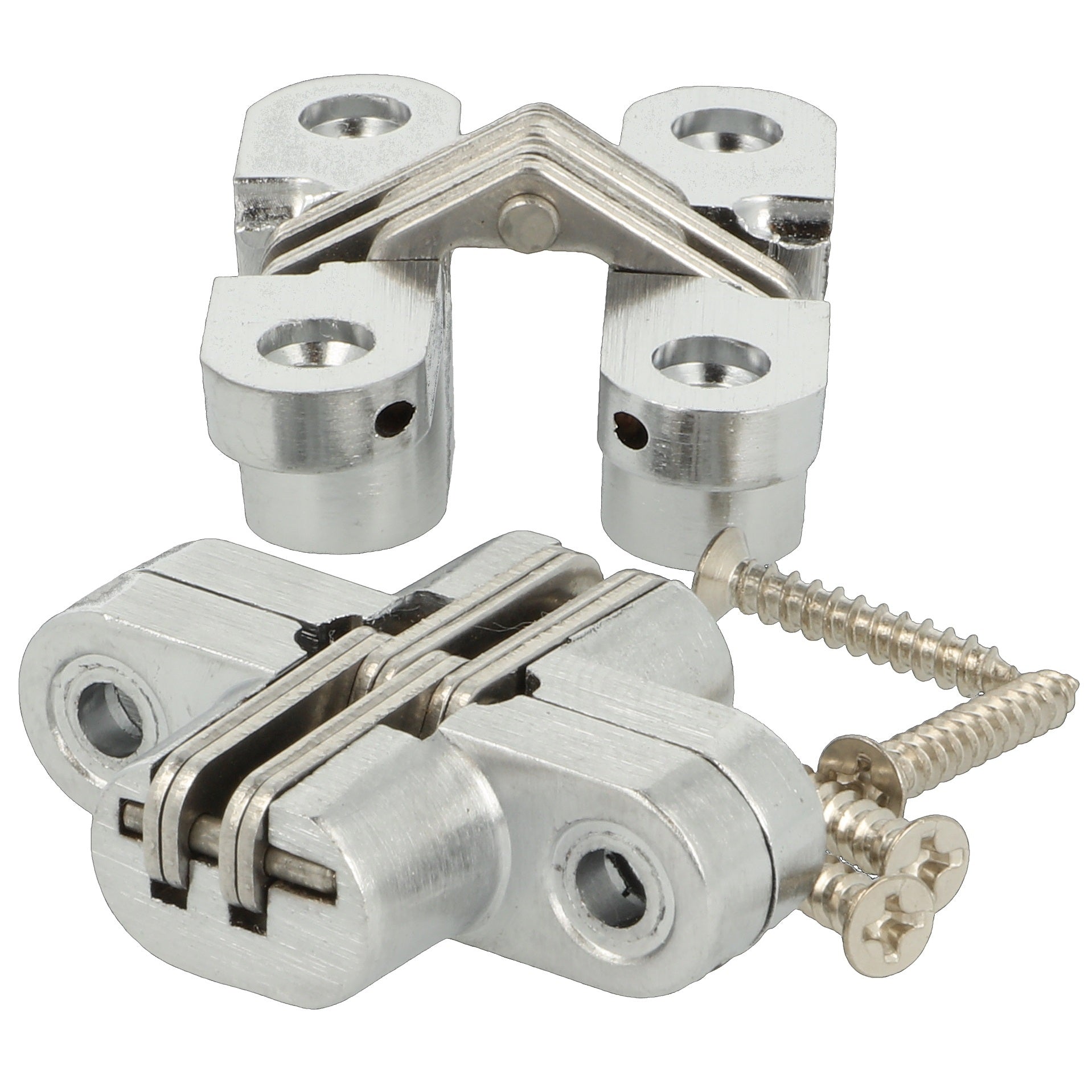 Two high-quality invisible cross hinges, 45 x 13 mm, made of Zamak, with a stainless steel look, including screws. Concealed furniture hinge from UMAXO®, folds 180°. Hidden furniture hinge (vici hinge) for recessed installation.