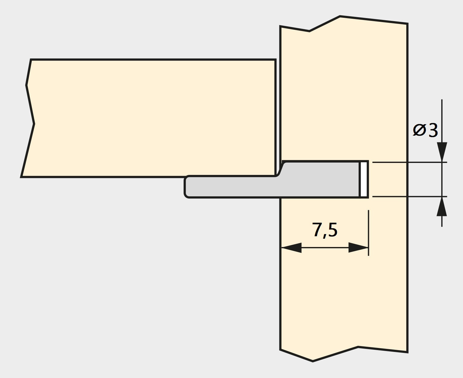 • The shelf support 8049707 is inserted into the pre-drilled mounting hole with a diameter of ⌀3 mm (1/8″) and a depth of at least 7.5 mm (19/64″) in the cabinet wall