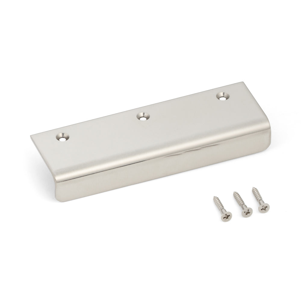 High-quality, solid stainless steel angled handle, 120 mm (4.8"), mirror polished, SN-120M. Furniture handle SN-120M for boats, yachts, stainless steel kitchens, beach hotels, doctor's offices, kitchen cabinets, and drawers, by Sugatsune / LAMP® (Japan)
