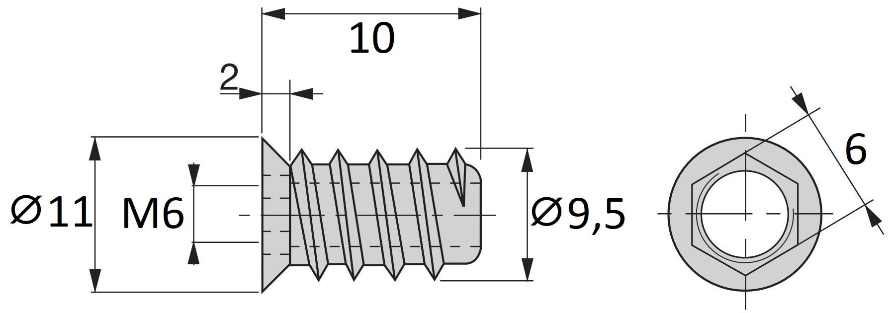 Application: Screw-in nut for furniture, wooden board, chipboard, table and much more. The screw-in sleeves 8028001 M6 x 10 mm serve as thread adapters to install metric thread M6 in wooden panels, furniture, chipboard, tables, worktops. [caption id="attachment_140882" align="alignnone" width="420"]