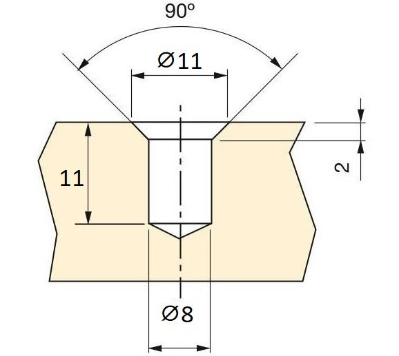 - For the screw-in nut, a hole with a diameter of ⌀8 mm (5/16″) and a depth of 11 mm (7/16″) must be drilled in the wooden wall (for further details see assembly drawing ).