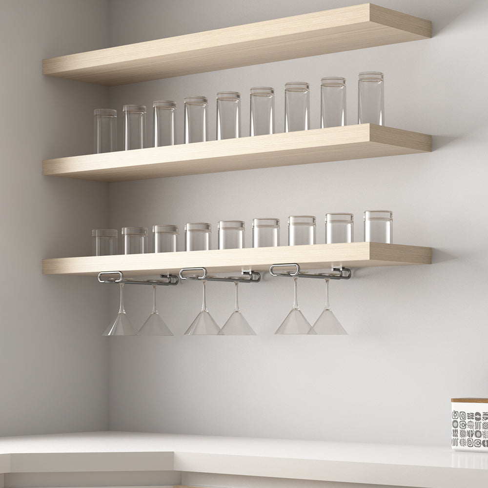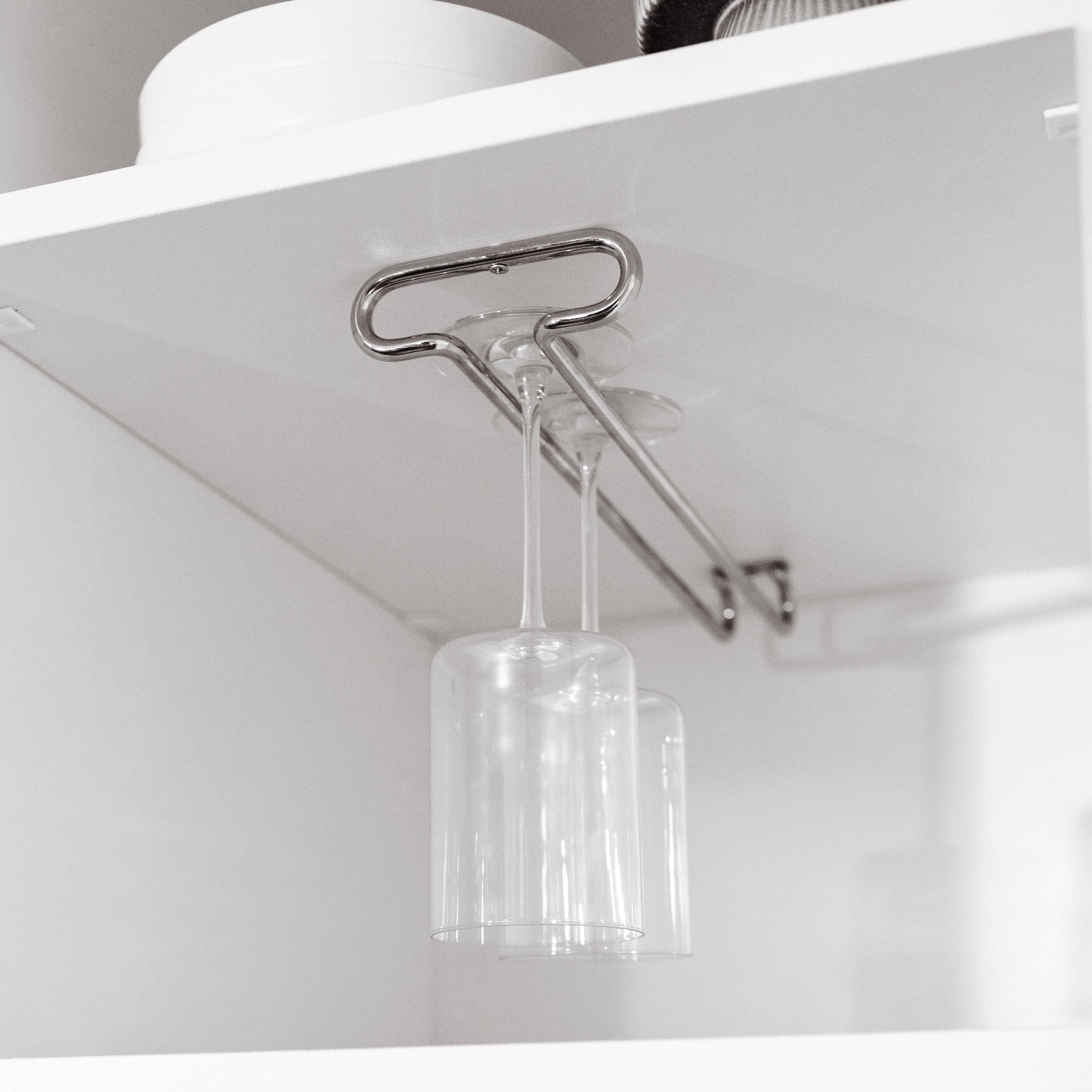 The wine glass holder 8930011 made of robust steel immediately creates order and clarity in wall cabinets or under shelves.