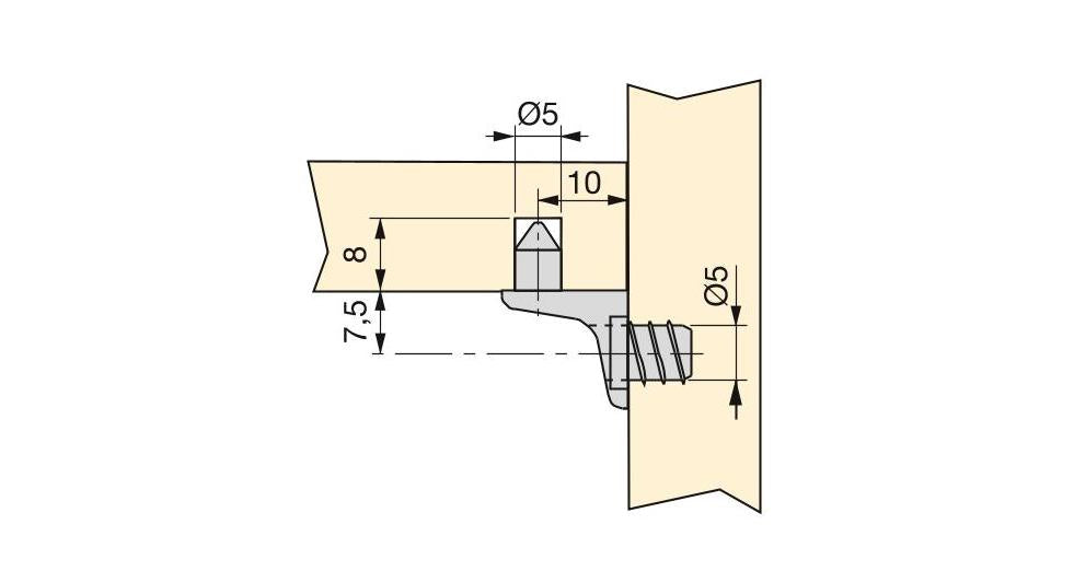 - The shelf support 8114107 is screwed into a hole with a diameter of Ø5 mm (13/64″) (ideal for the hole row)