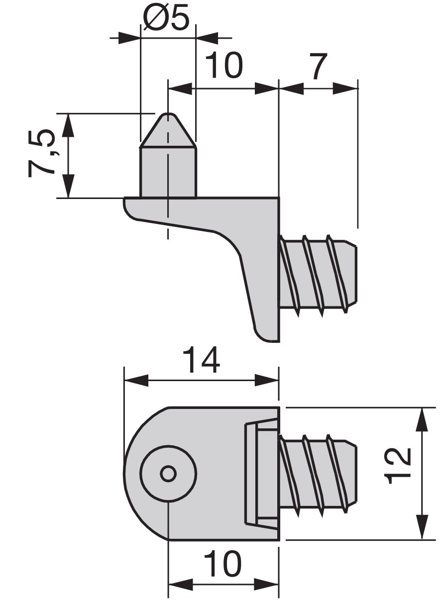 Application: Zinc alloy shelf support with pre-assembled screw, for hole row, shelves, compartment floors, cabinet floors, shelves, cabinets, racks and much more. The high-quality shelf supports 8114107 with pre-assembled screw are highly resilient and durable. The shelf supports have a rectangular shape to optimally support shelves. They are ideal for furniture with Ø5 mm hole rows or drill holes with a diameter of Ø5 mm (13/64″). For better locking of the shelves, the shelf supports 8114107 have an additional fastening pin on the upper surface with a diameter of Ø5 mm (13/64″) and a length of 7.5 mm (19/64″). The shelf support 8114107 is ideal for, among other things:- office cabinet