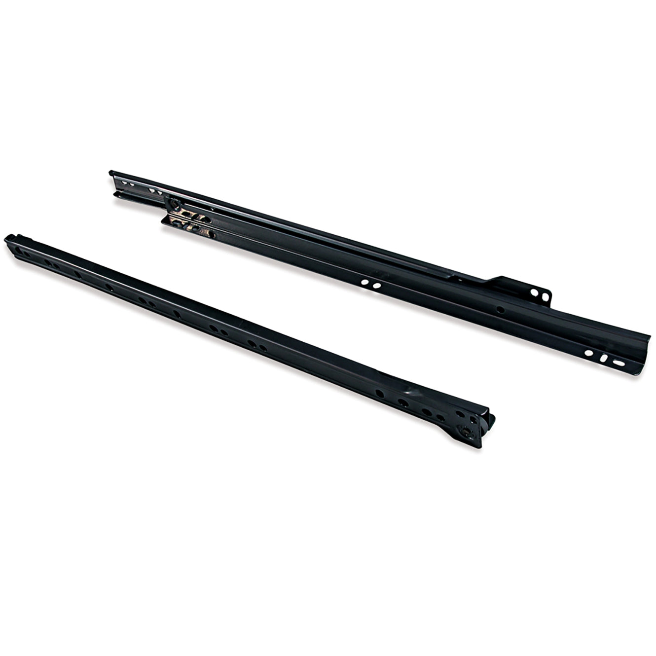 Roller drawer runners, partial extension, black lacquered, RAL 9005, 600 mm (23.7"). Steel guide rails with partial extension, for wooden drawers, pull-out shelves, wooden drawers, kitchen furniture, office furniture, and home furniture, by EMUCA