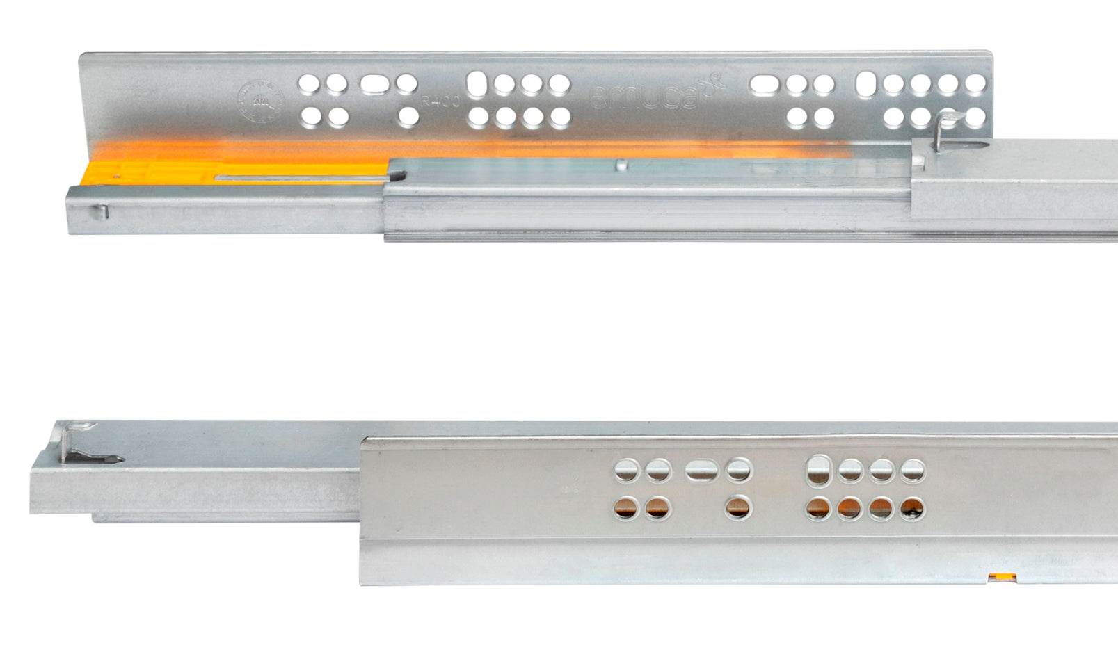 Underfloor guides, 3124705, 600 mm (23-5/8"), by EMUCA, load capacity: 30 kg (67 lbs), design: full extension with soft-close. Guide rail in extended position.