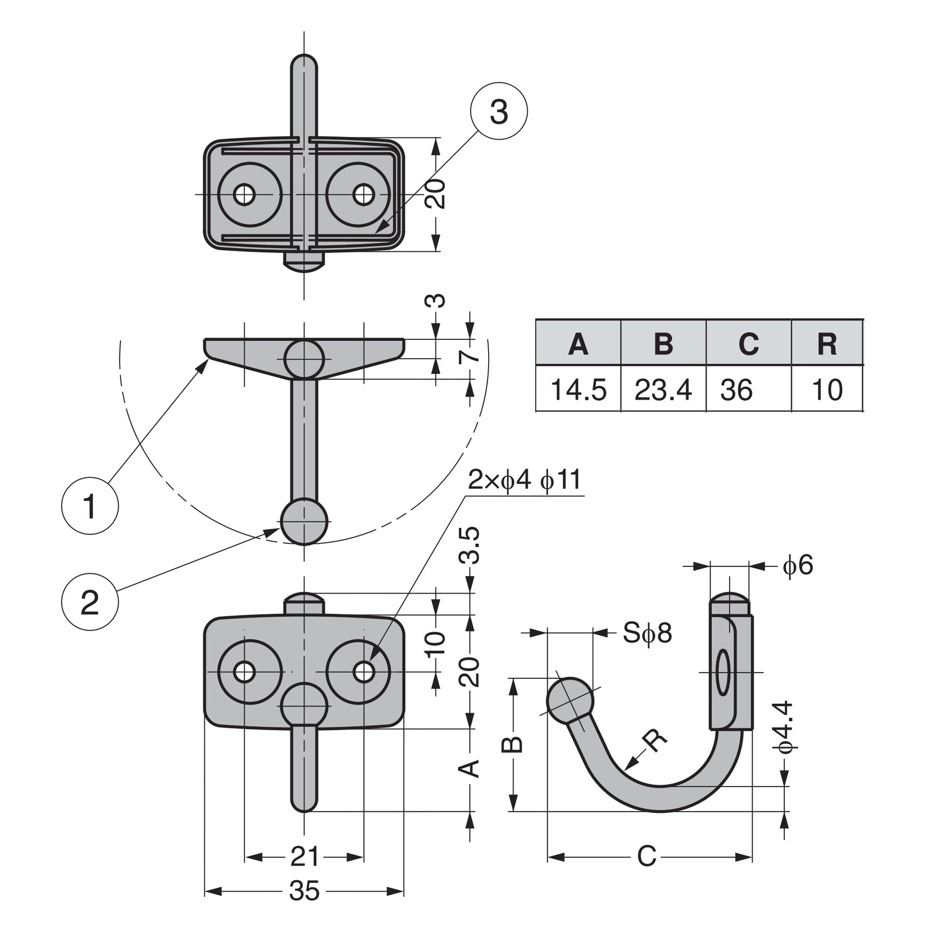 2 crochets pivotants de haute qualité TK-30 en acier inoxydable pour montage mural, petits.