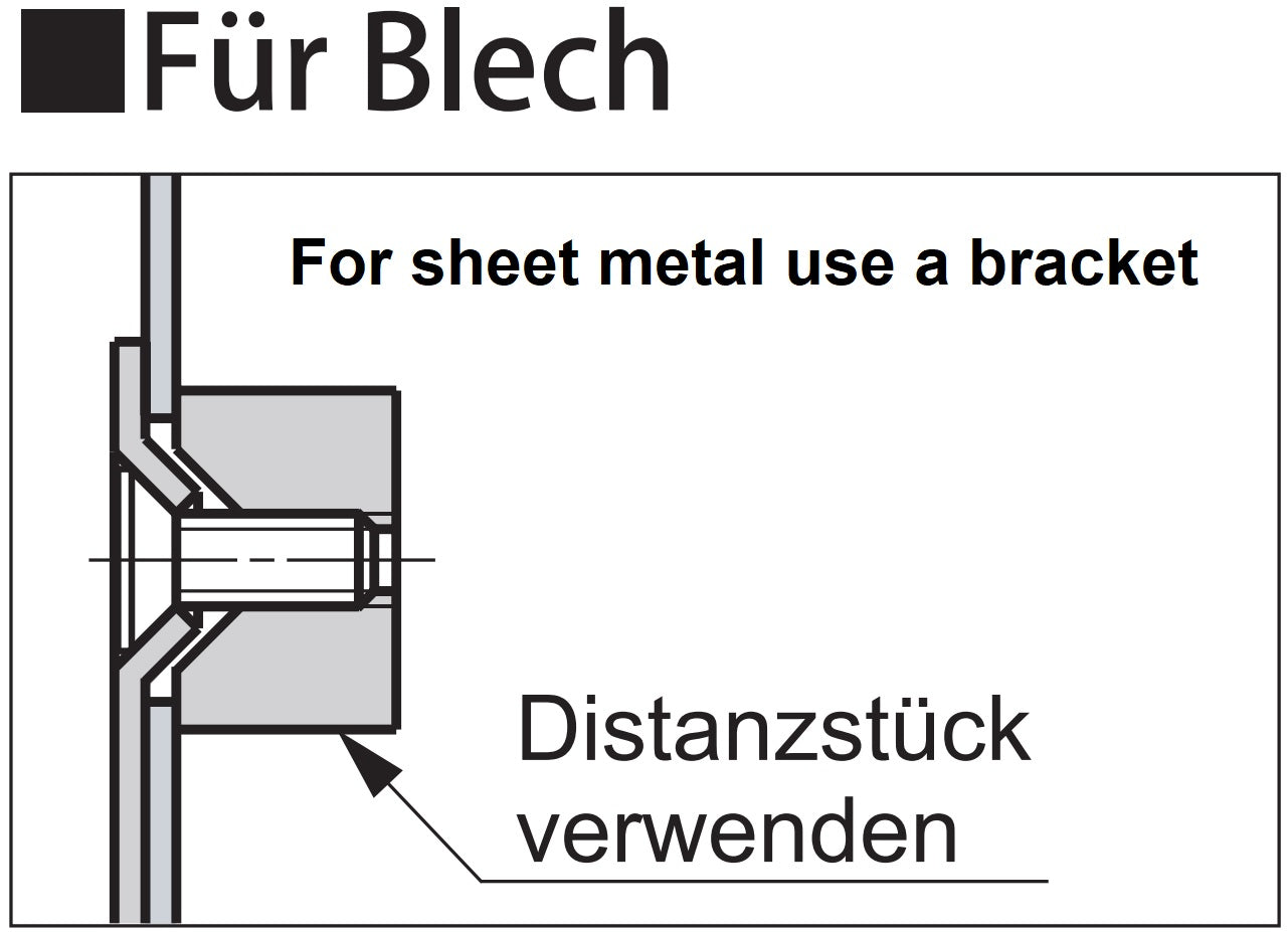 • Les poignées pliantes en acier inoxydable en forme d'anneau 980643 peuvent également être installées dans de la tôle à l'aide d'une entretoise et de quatre vis autotaraudeuses M3. Ceux-ci ne sont pas inclus dans la livraison (pour plus de détails, voir le dessin de montage )