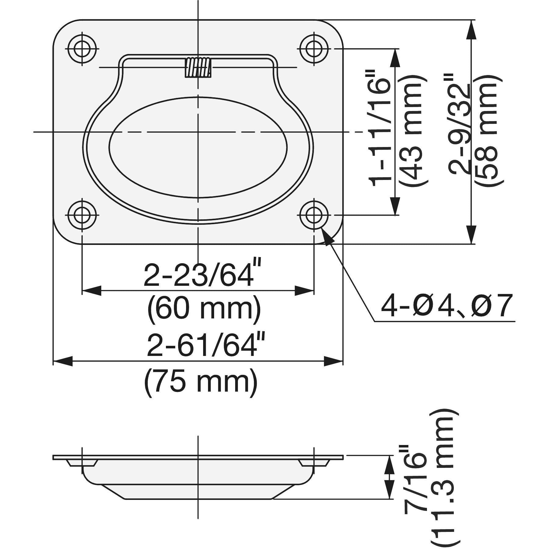 [caption id="attachment_46613" align="alignnone" width="420"] Poignée pliante en acier inoxydable SUS304 en forme d'anneau Sugatsune, 980643 (75 mm), polie brillante. Dessin technique[/caption] Inclus dans la livraison :