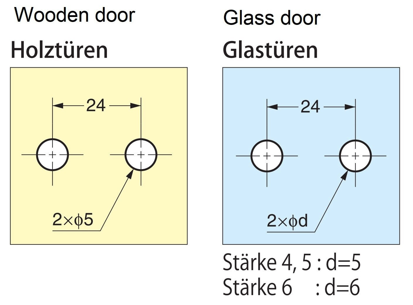 - Pour la fixation, des trous doivent être préparés dans la porte ( voir dessin )