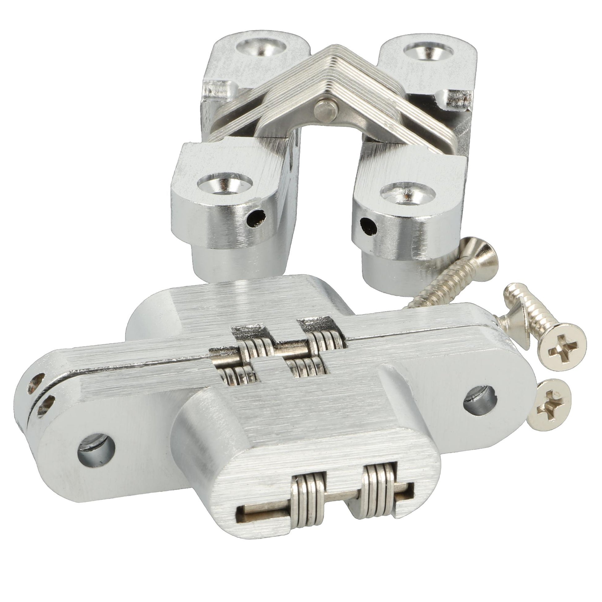 2 Stück hochwertige unsichtbare Kreuz-Scharniere 70 x 16mm aus Zamak, Edelstahl-Look, inkl. Schrauben. Verdecktes Möbelband von UMAXO®, 180° klappbar. Verstecktes Möbelscharnier (vici hinge) zum einlassen