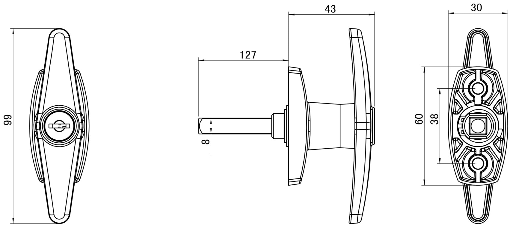 Hochwertiger abschließbarer Garagentorgriff mit Schließzylinder, aus Zamak, mit 8 mm Vierkant und zwei Schlüsseln, für Frontmontage, Ausführung: verschiedenschließend, 14.08.052-0. Kreuzgriff aus Zamak für Garagentor und viel mehr, von SISO Denmark