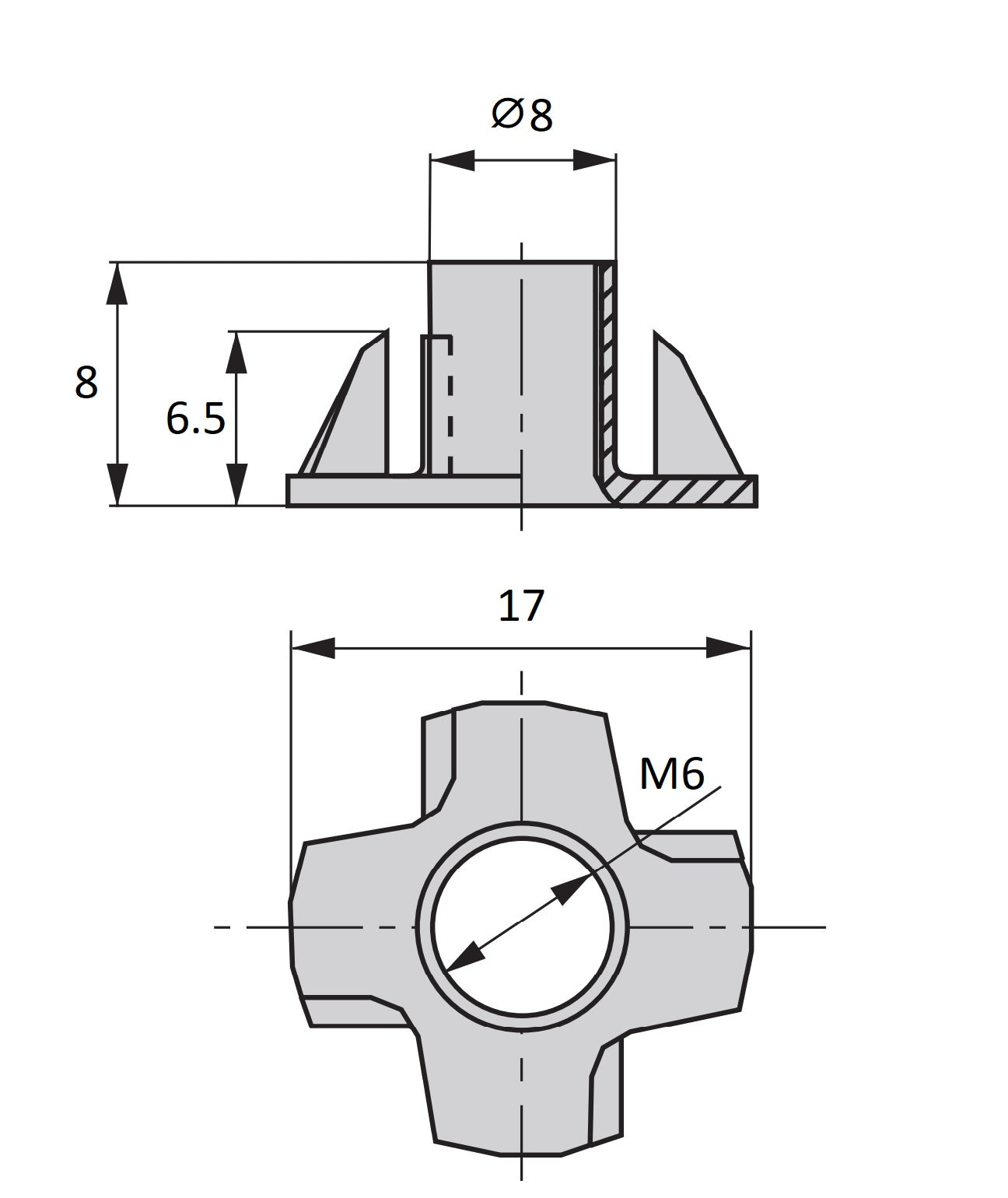 [caption id="attachment_132904" align="alignnone" width="353"] Einschlagmutter mit M6 Gewinde, 8 mm, von EMUCA, verzinkt. Technische Zeichnung[/caption]   Im Lieferumfang enthalten: