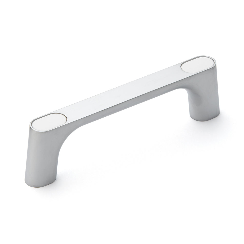 Hochwertiger Gerätegriff aus massiver Zinklegierung (ZDC), verchromt, satiniert matt, mit weißen Abdeckkappen KMH-120-WT