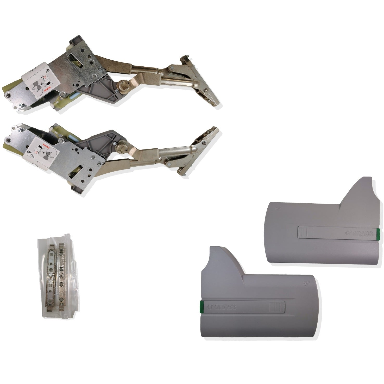 GRASS Hetal Kinvaro L-80 Klappenliftbeschlag mit Öffnungsunterstützung und einstellbarer Schließdämpfung. Klappenbeschlag mit grauen Abdeckkappen (ohne Quertraverse)