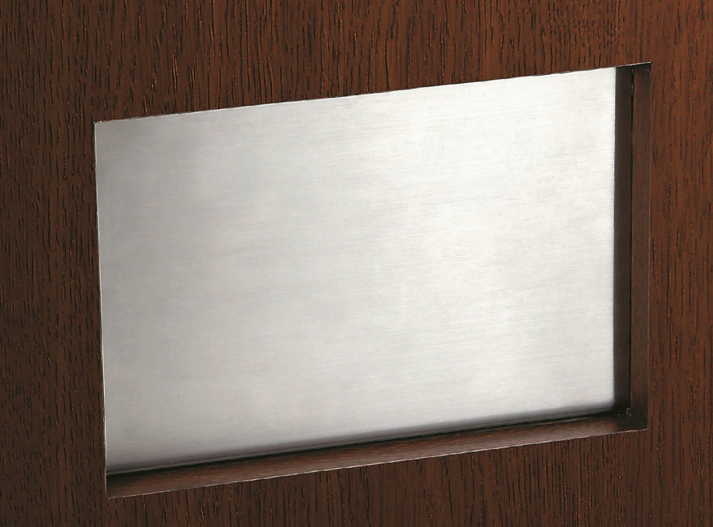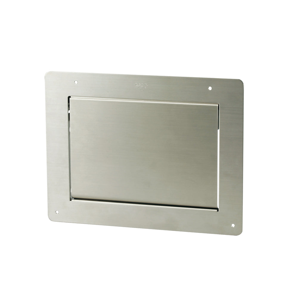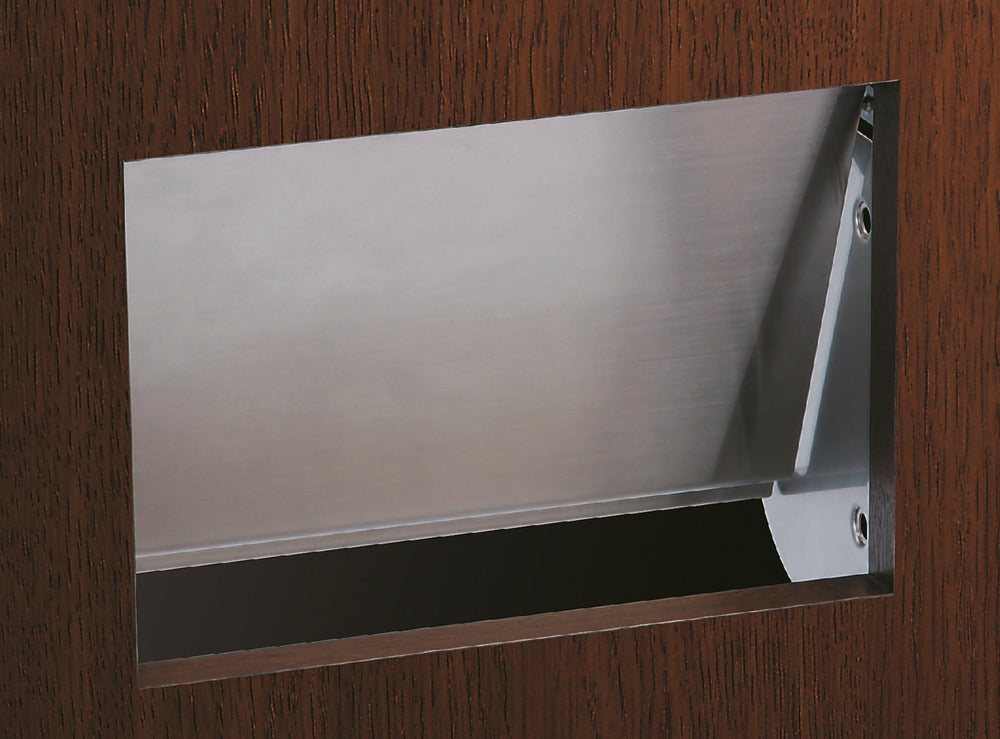 Hochwertige rechteckige Müllklappe für die senkrechte Montage, mit Soft-Close, aus rostfreiem Edelstahl, Ausführung: Innenmontage, AZ-GD231-HL. Edelstahlmüllklappe, für Gastronomie und viel mehr, von Sugatsune / LAMP® (Japan)