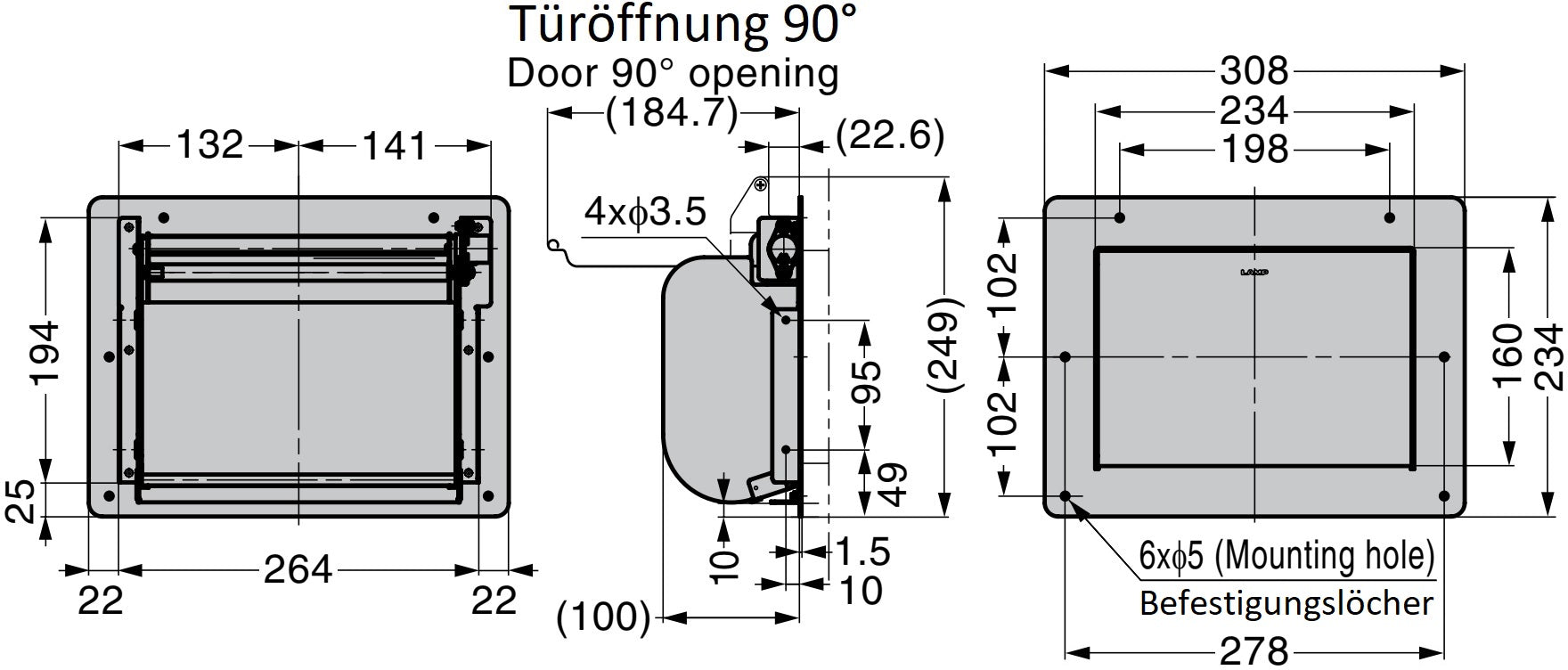 - Öffnungswinkel der Klappe: 90°