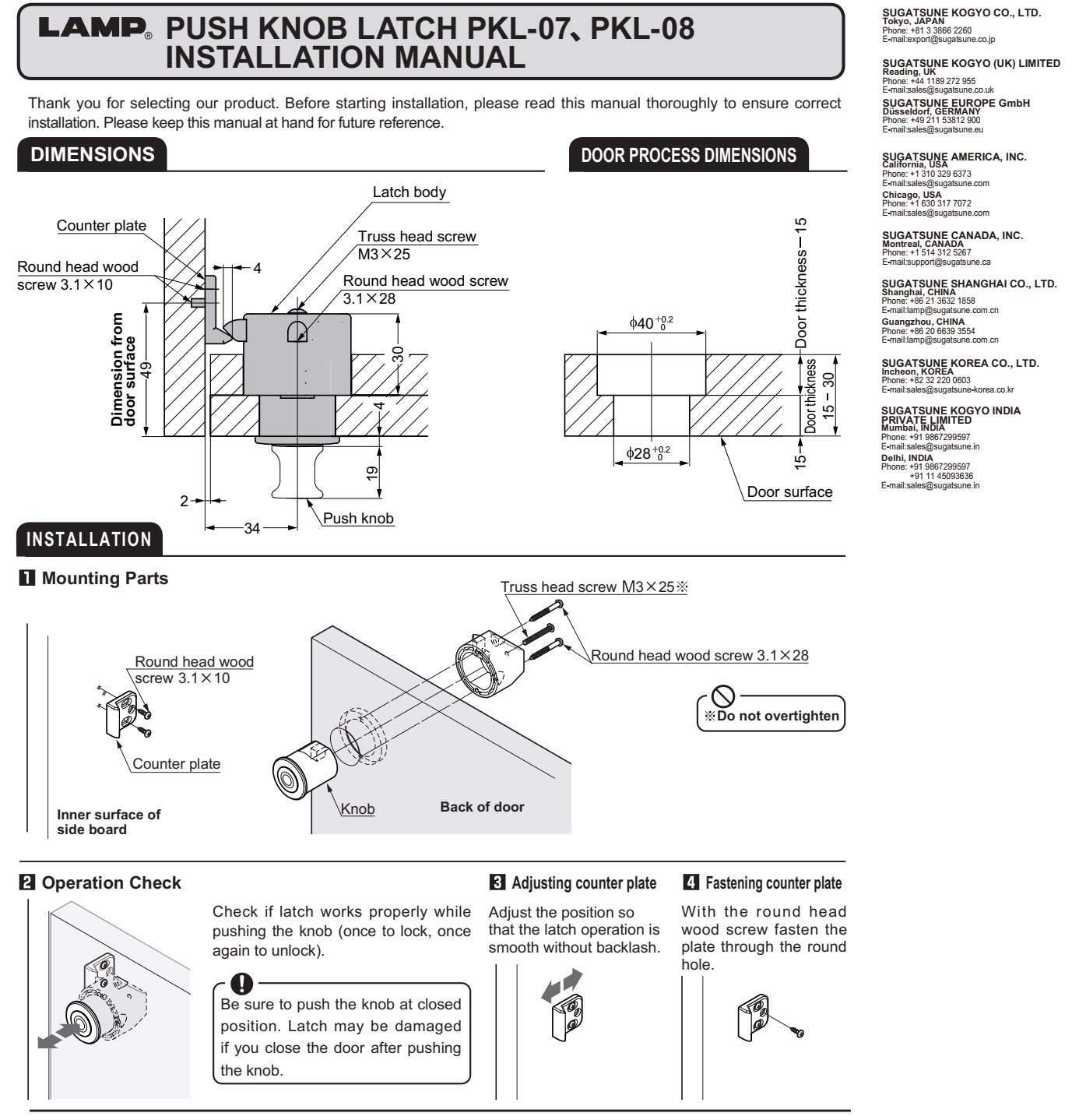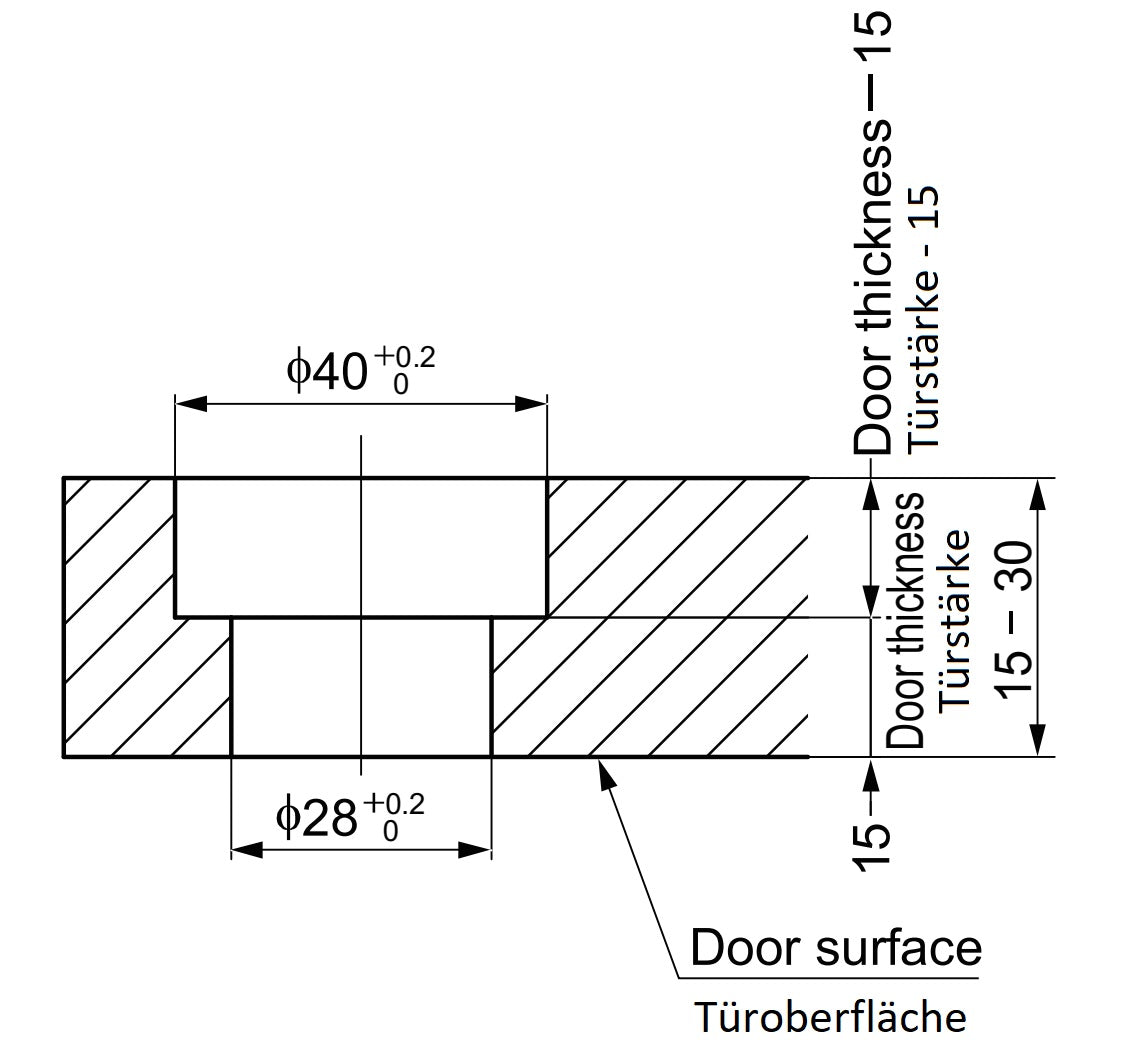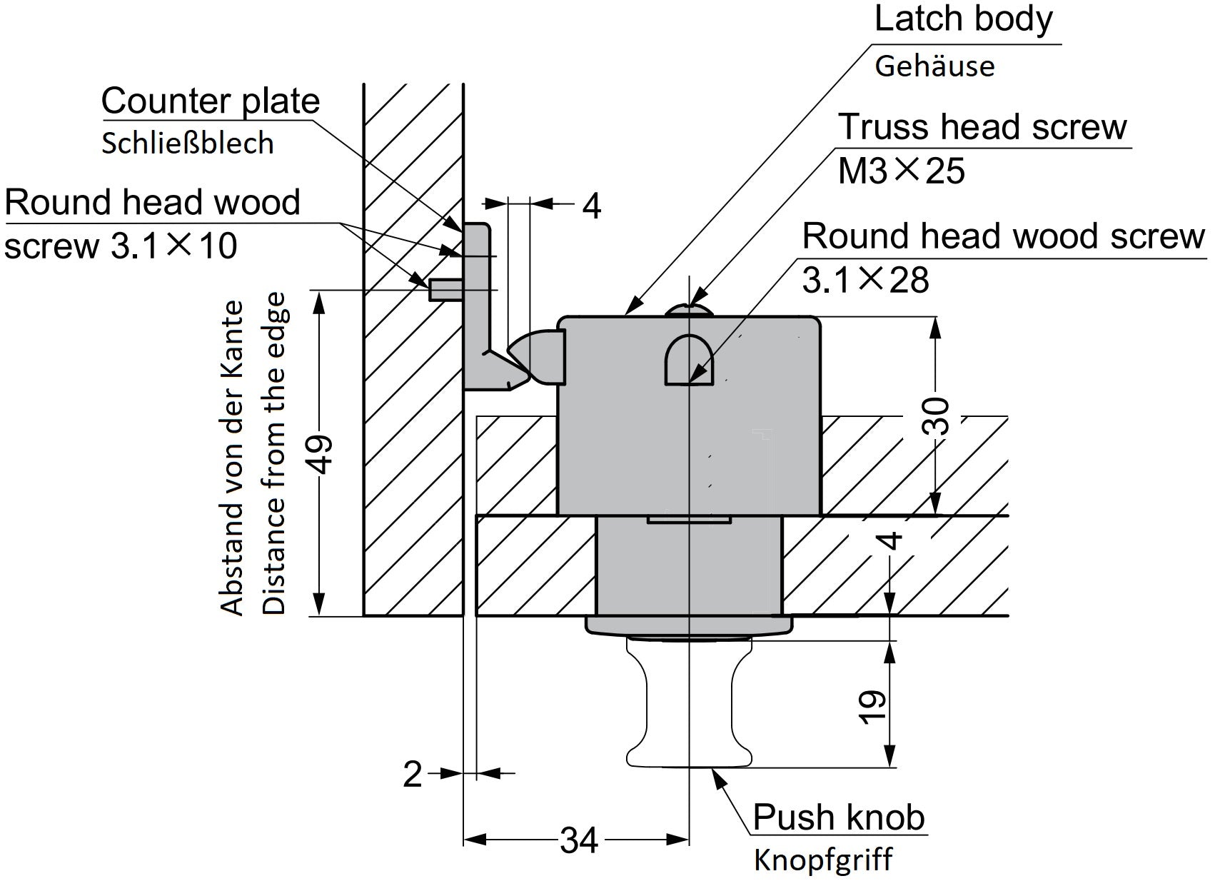 Der Druckknopf PKL-08/GA und PKLW ist für die Türstärke zwischen 15 mm (19/32″) und 30 mm (1-3/16″) geeignet.