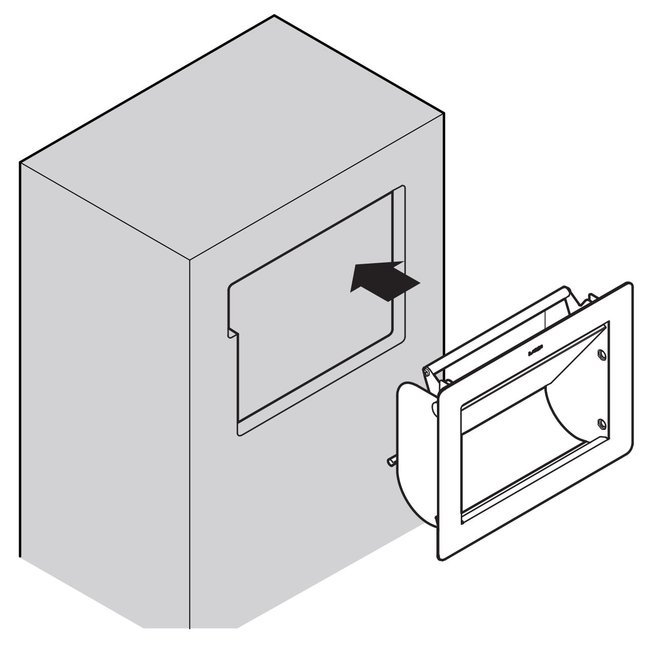 - Für die Montage der Müllklappe AZ-GD230-HL muss in der Korpuswand ein Ausschnitt mit den Maßen 265 mm (10-7/16″) x 215 mm (8-15/32″) durchgeführt werden
