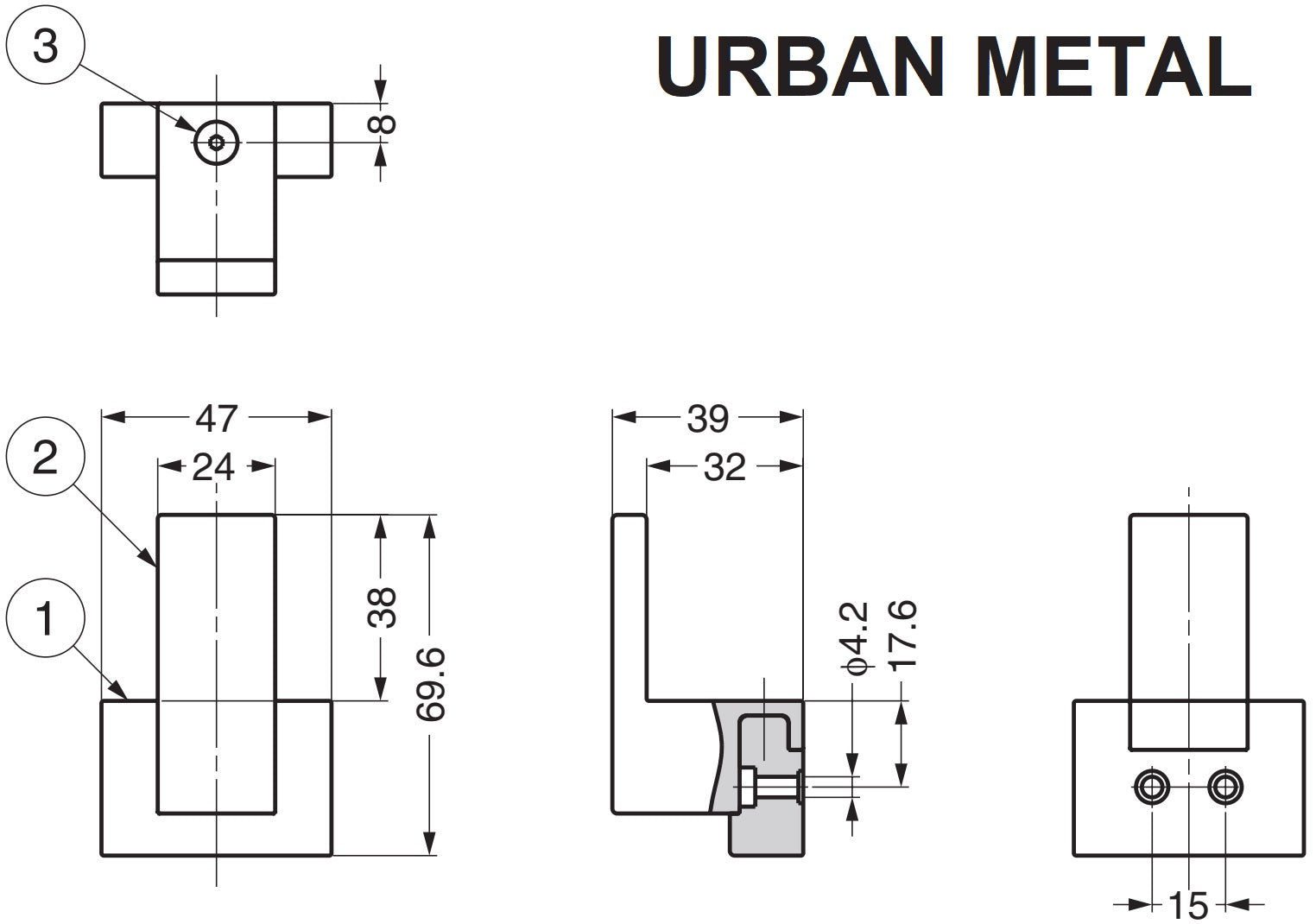 - Die Designhaken PXB-UM05-101-ST haben zwei Befestigungslöcher mit dem Durchmesser ⌀4,2 mm (11/64″), mit Senkung
