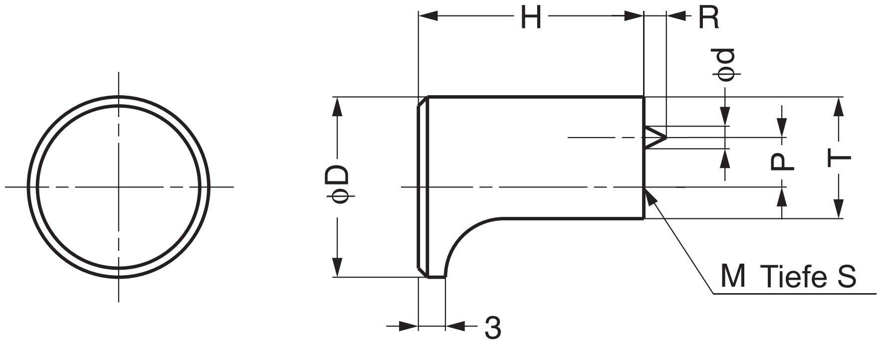 • Der Griff besitzt zusätzlich eine Nadel mit der Länge (R) 2 mm (5/64″) und dem Durchmesser (⌀d) ⌀2 mm (5/64″). Diese Befestigungsnadel sorgt dafür, dass der Knopfgriff sicher und stabil montiert ist und sich bei der Benutzung nicht dreht