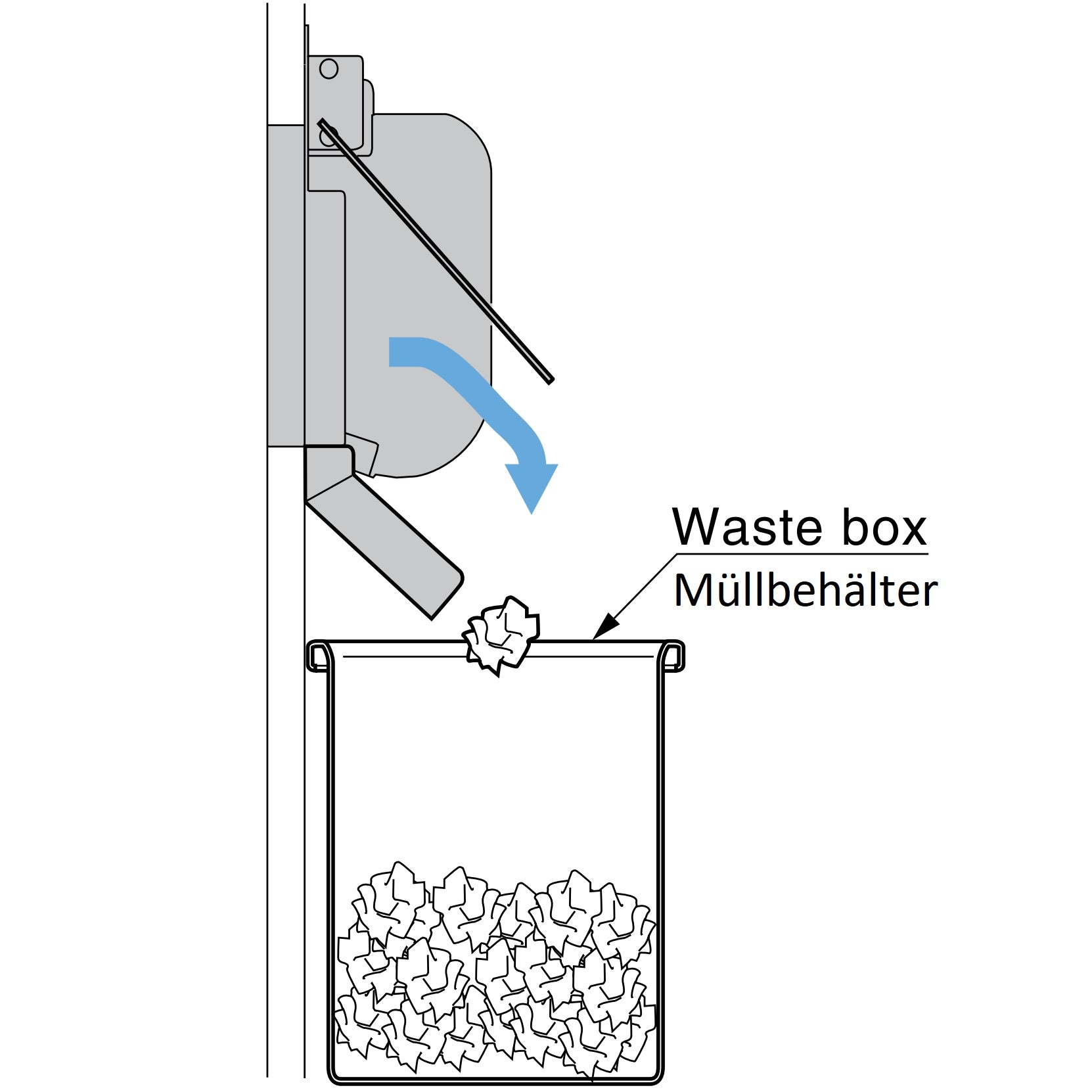 - leitet Einwurfgegenstände sicher in einen Behälter mit einer 94 mm (3-45/64″) Entfernung von der Müllklappe
