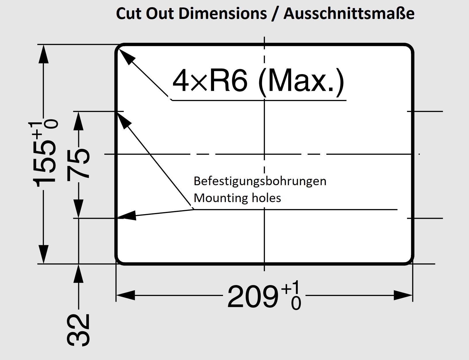 - Für die Montage der Müllklappe AZ-GD180-HL muss in der Korpuswand ein Ausschnitt mit den Maßen 209 mm (8-15/64″) x 155 mm (6-7/64″) durchgeführt werden