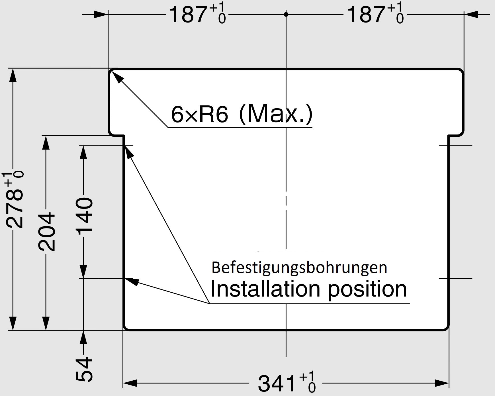 - Für die Montage der Müllklappe AZ-GD310-BL muss in der Korpuswand ein Ausschnitt mit den Maßen 341 mm (13-27/64″) x 278 mm (10-15/16″) durchgeführt werden