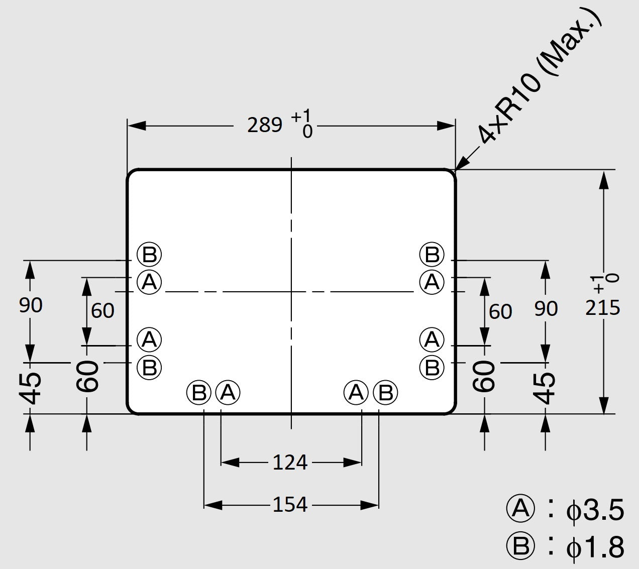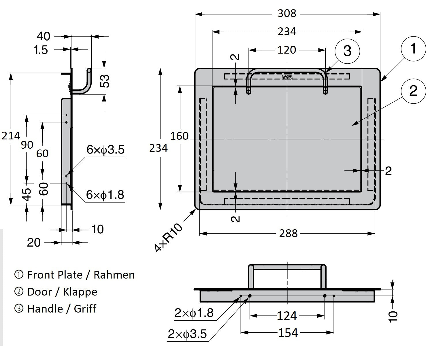 - Die Edelstahlmüllklappe AZ-HD230-HL hat sechs Befestigungslöcher mit dem Durchmesser ⌀3,5 mm für Befestigung mit Schrauben