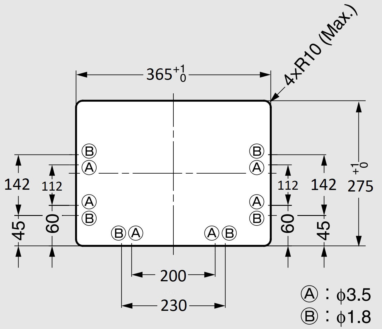 - Für die Montage der Müllklappe AZ-HD310-HL muss in der Korpuswand ein Ausschnitt mit den Maßen 365 mm (14-3/8″) x 275 mm (10-53/64″) durchgeführt werden