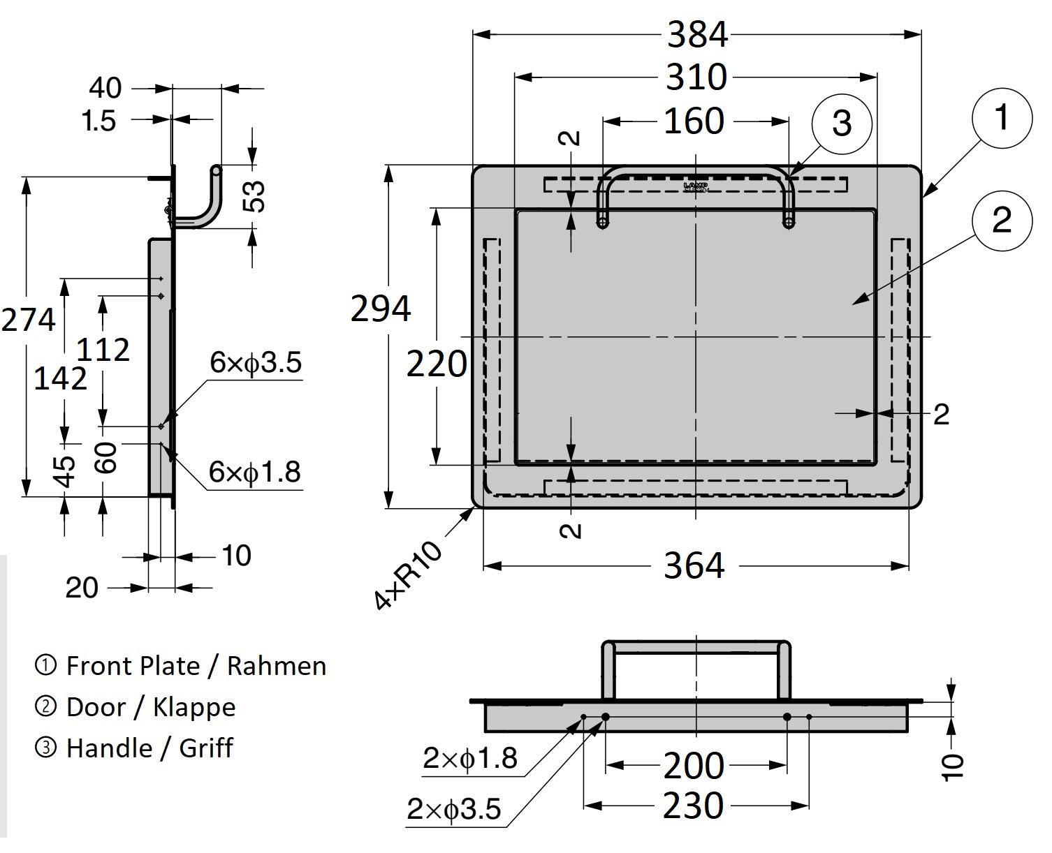 - Des Weiteren hat die Edelstahlmüllklappe AZ-HD310-HL auch sechs Befestigungsbohrungen mit dem Durchmesser ⌀1,8 mm für Befestigung mit Nägel (für weitere Details s. Montagezeichnung)