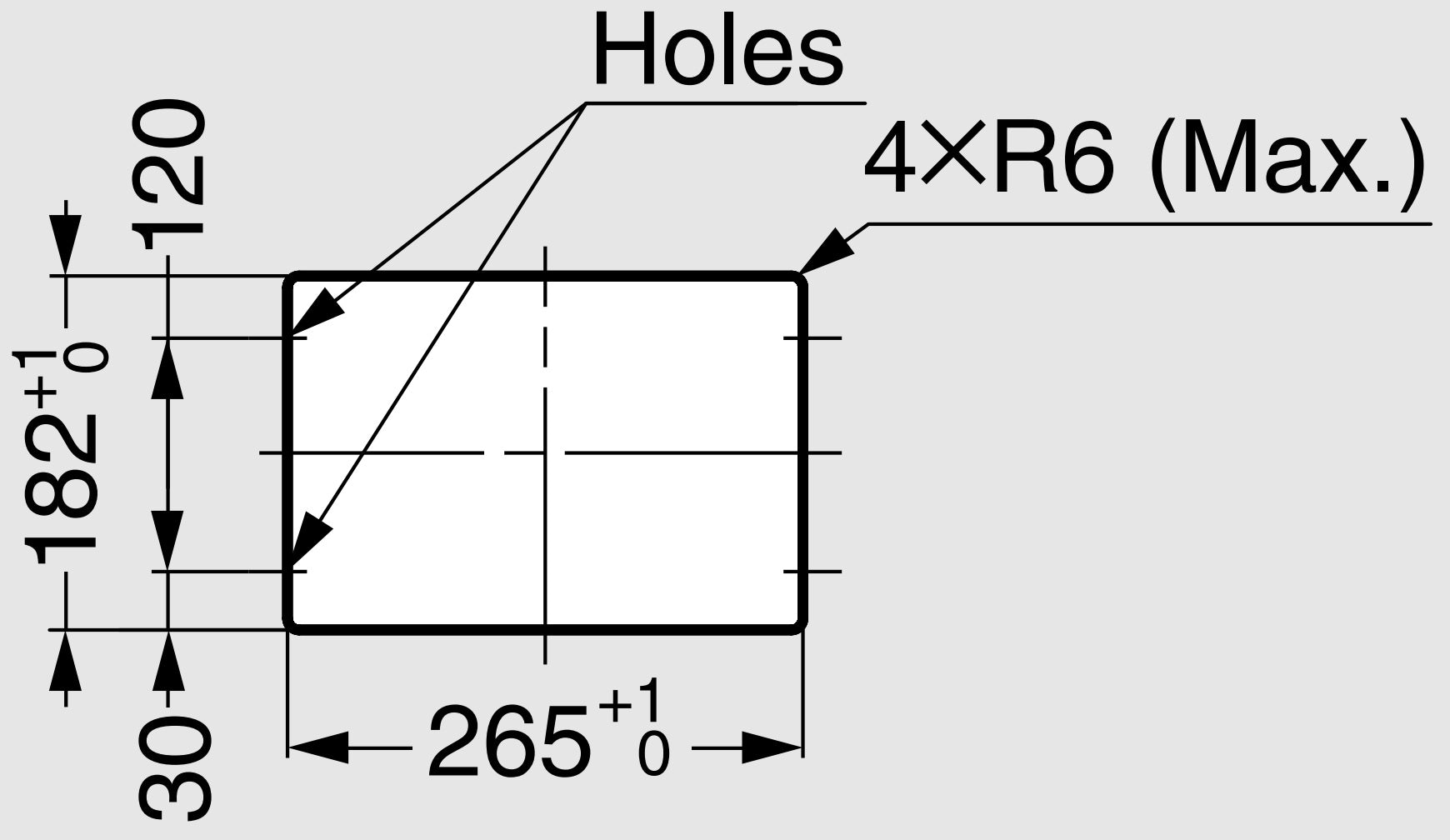 - Für die Montage des Mülldurchwurfs AZ-ND230-HL muss in der Korpuswand ein Ausschnitt mit den Maßen 265 mm (10-7/16″) x 182 mm (7-11/64″) durchgeführt werden