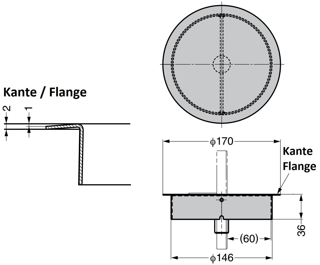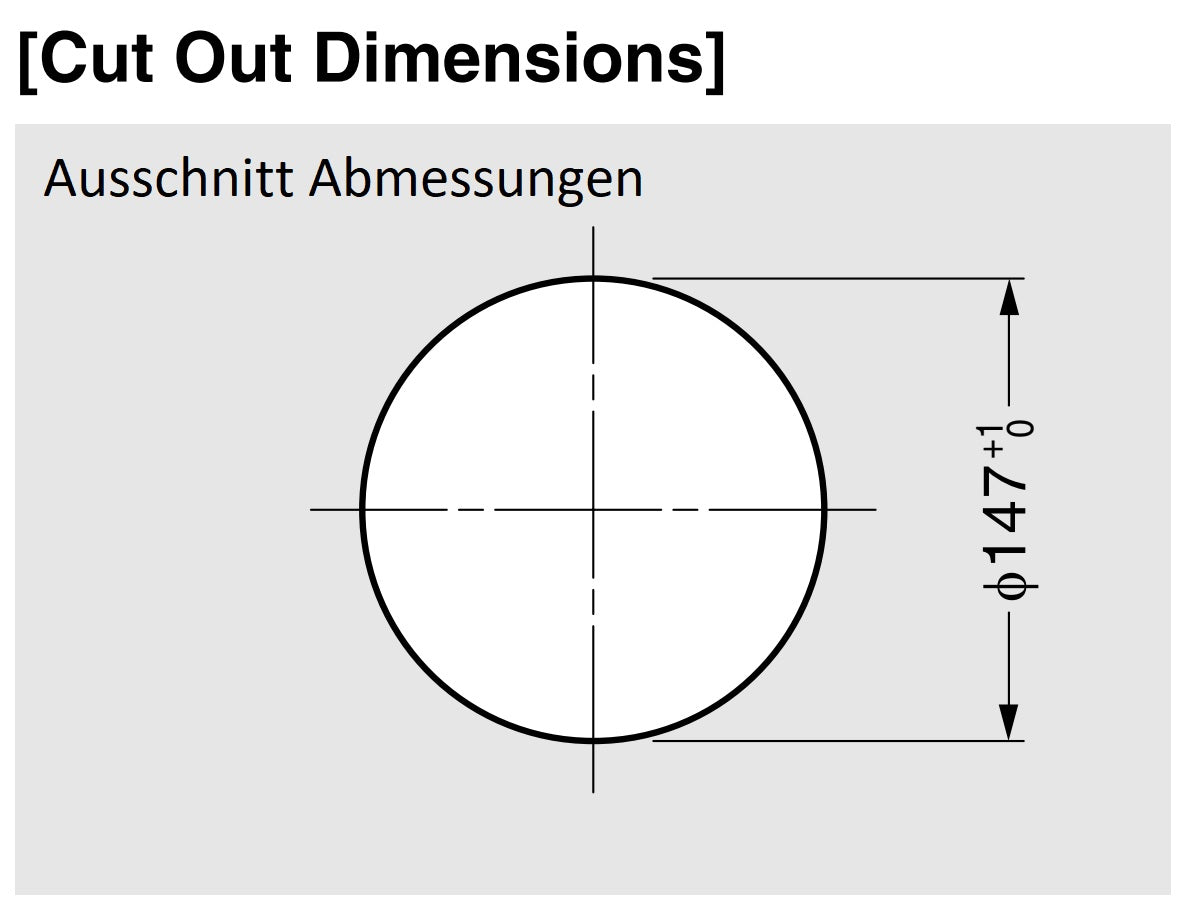 - Für die Montage der Müllklappe AD-DH015-HL muss in der Oberfläche eine Bohrung mit dem Durchmesser ⌀147 mm (5-25/32″) durchgeführt werden (für weitere Details s. Montagezeichnung)